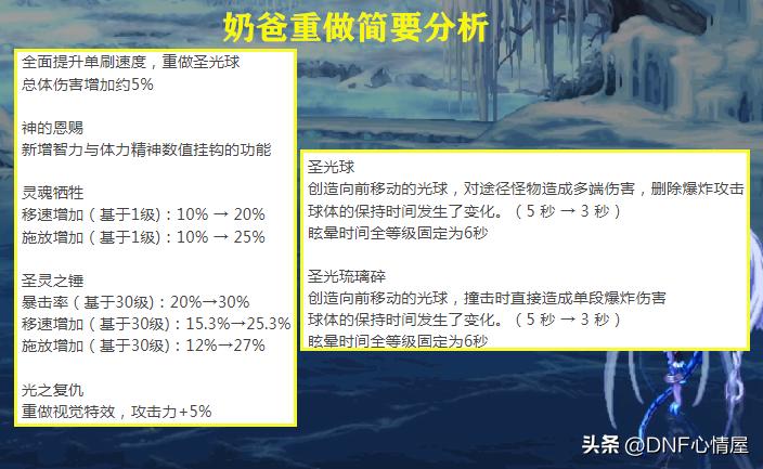 奶爸这个职业,经过重做改版后,全面提升单刷速度,“圣光球”技能重制,总体伤害增加约5%左右。但对于基础精通流来说,不是一件好事,当学习了“圣灵之锤”,罩子、守护、大风等等技能,就没办法使用了。也就是说,改变了审判职业,安逸的单刷输出环境。
