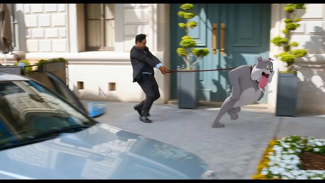 结果开场的第一眼我就傻眼了,居然是“动画+真人”电影。这种形式也不是不行,但这次《猫和老鼠》是在真人画面里加入了二维动画!也就是说,场景是三维的、立体的,就是用摄影机拍下来的真实世界,但出现在这个真实世界里的汤姆和杰瑞,是两个纸片人……