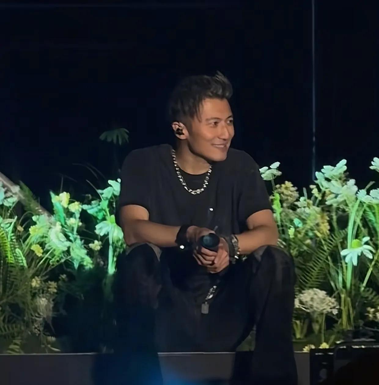 后面唱情歌的时候,谢霆锋依旧没有换衣服,还是这身打扮,但唱起情歌来却深情款款。