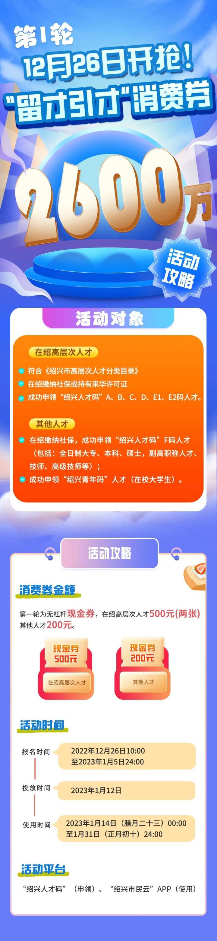 1.2023年1月5日前已申领“绍兴人才码”且符合条件的在绍高层次人才无需申请,现金券将直接投放至本人“绍兴市民云”APP账户。还没有“绍兴人才码”的在绍高层次人才,领码后可主动申领,通过后可以同等享受,1月12日-28日申领的,我们将在2个工作日内发放,消费券不延长使用时间。