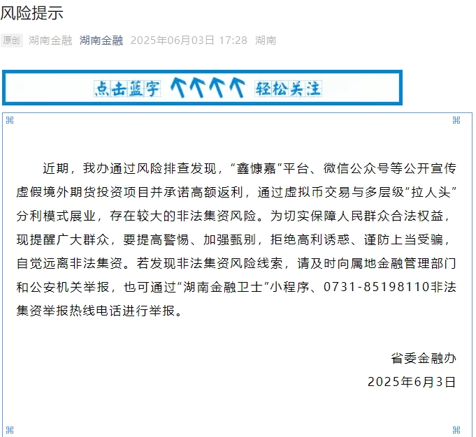 6月3日,湖南省委金融办称,通过风险排查发现,“鑫慷嘉”平台、微信公众号等公开宣传虚假境外期货投资项目并承诺高额返利,通过虚拟币交易与多层级“拉人头”分利模式展业,存在较大的非法集资风险。