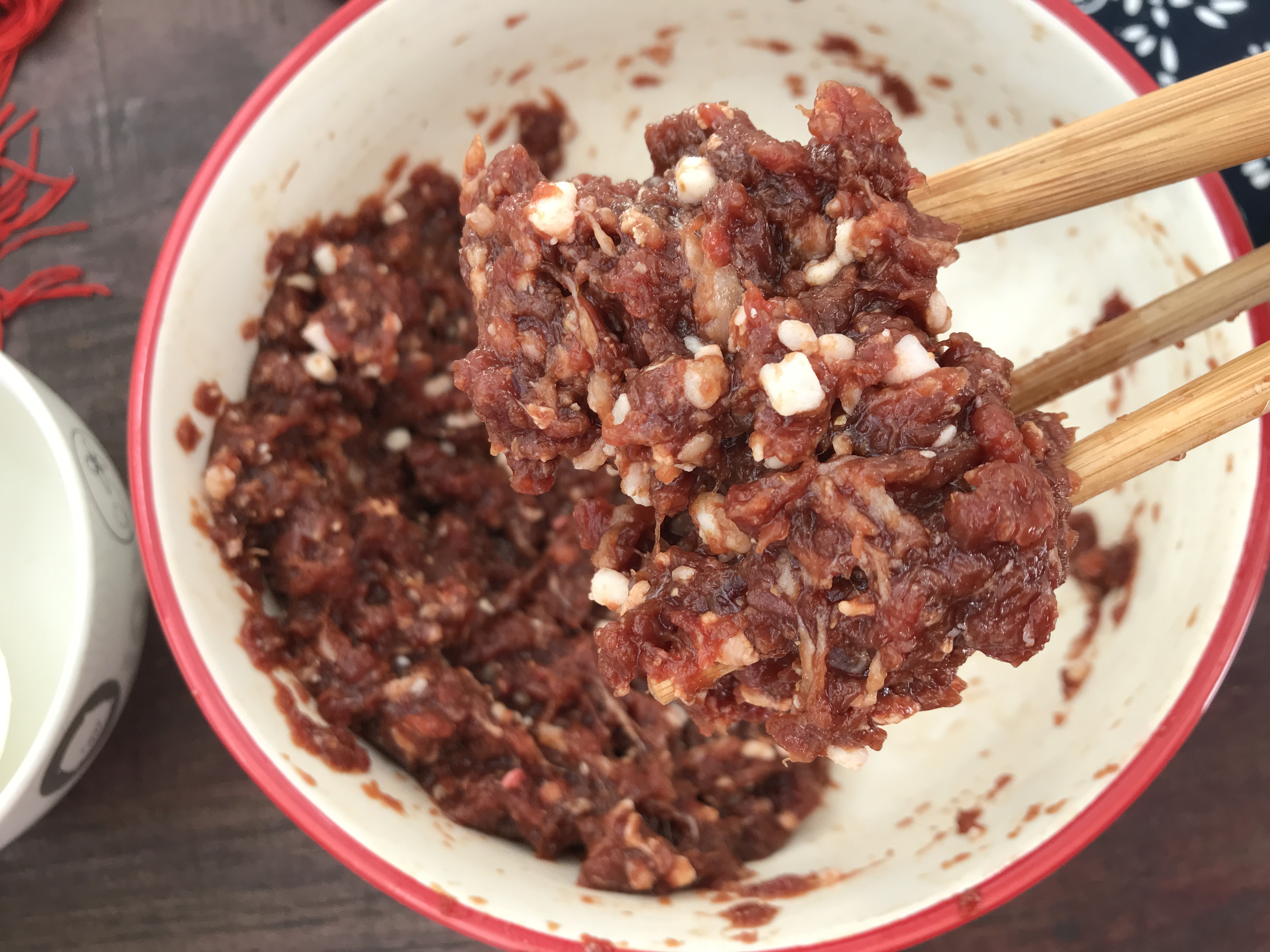 第五步:不用怕肉馅会稀,放心加,由于盐的渗透压作用,肉馅儿会越来越黏糊。图中的牛肉馅是加进去110克纯净水之后的样子,看起来非常黏稠,这样做的肉馅才会软嫩鲜香,咬一口爆汁儿。
