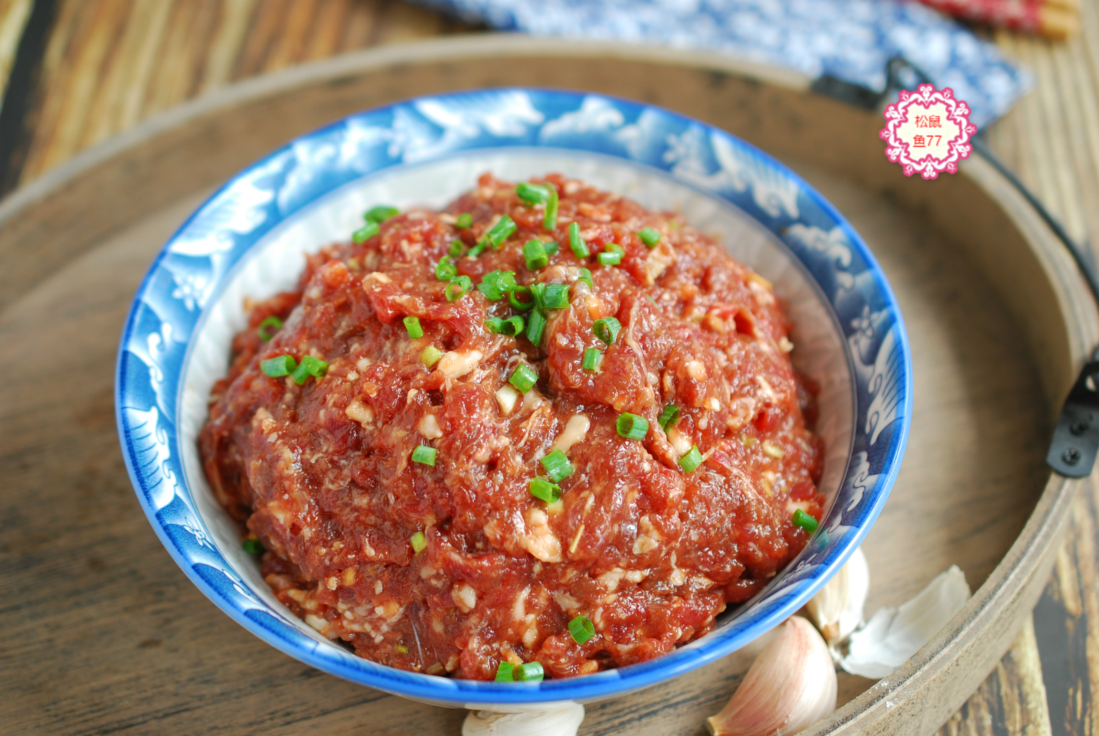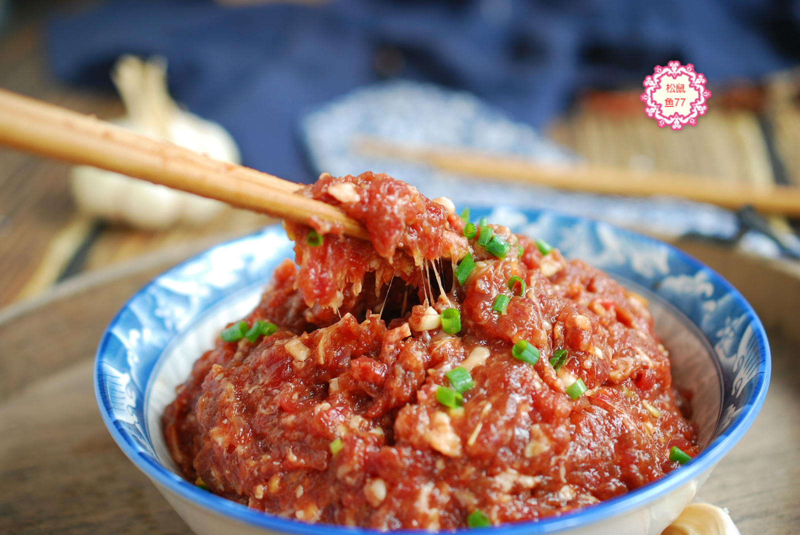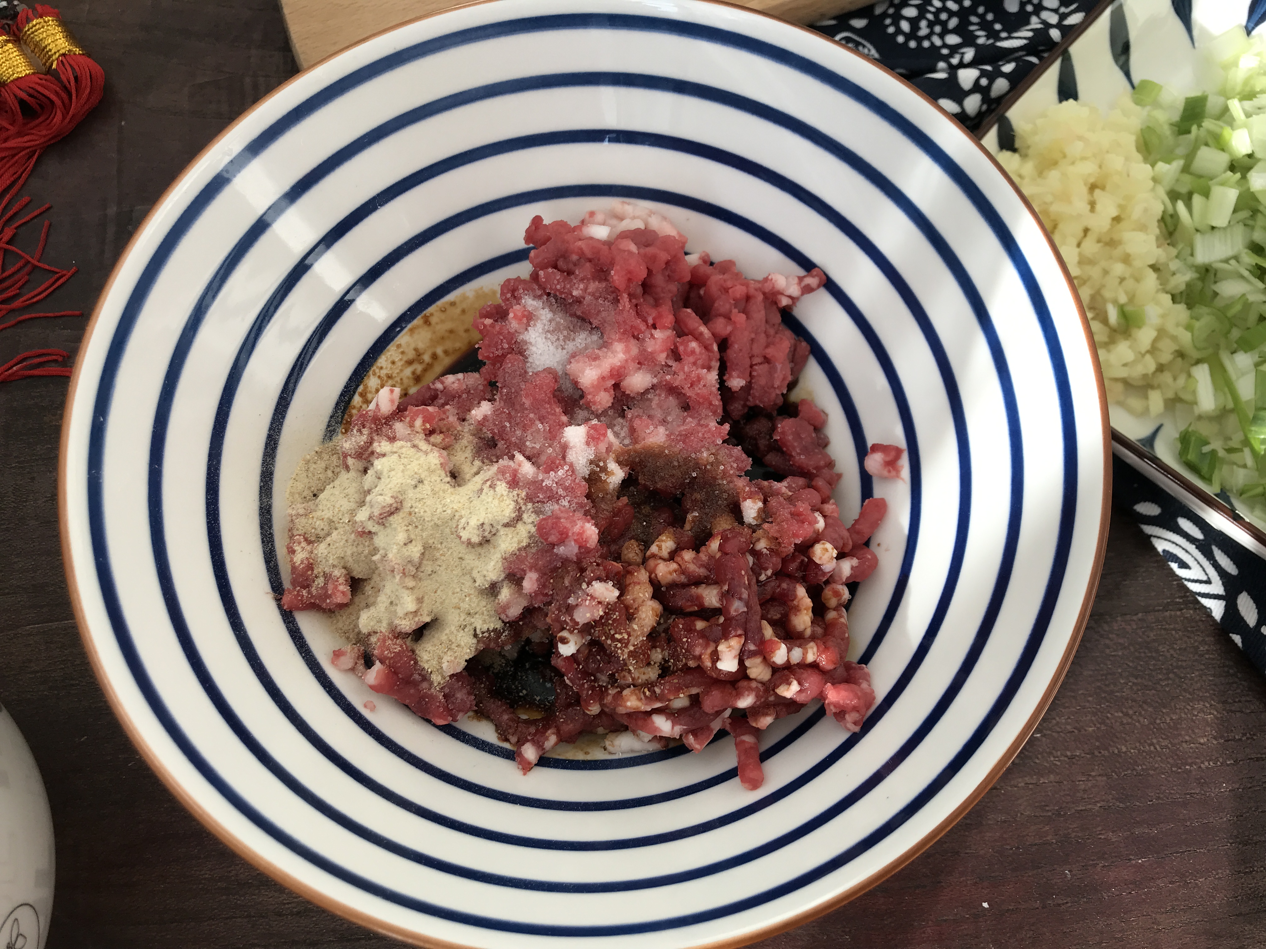 第七步:现在把切好的大葱碎和生姜末一起放进去,继续顺一个方向搅拌均匀。