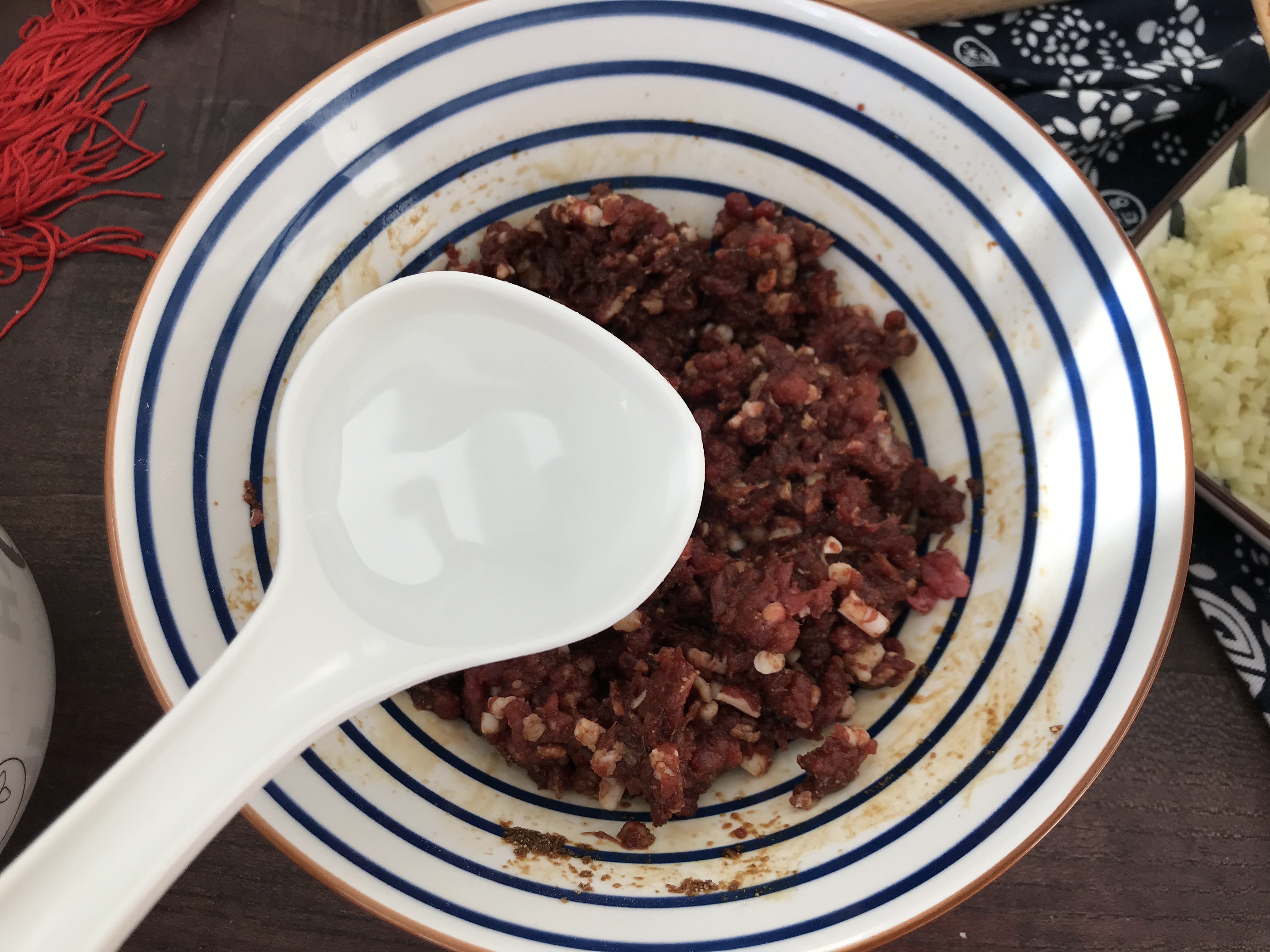 第四步:重点来了,调料都放好了,接着准备110克纯净水,对你没看错,是水!纯净水、矿泉水或者凉白开水都可以。110克纯净水分成三次打入牛肉馅中,每放一次顺着一个方向搅拌均匀后再加入下一次的纯净水,直到所有的水量都用完。