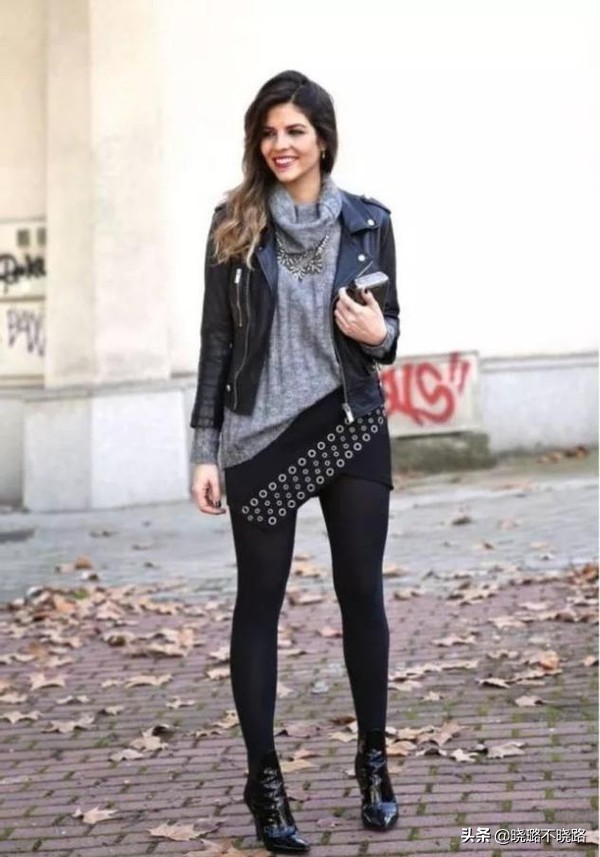 连裤袜+皮裙:同色系的搭配相较来说好很多,皮裙的酷感与连裤袜的保暖结合,整体搭配又时尚又保暖,并且黑色是一个显瘦颜色,腿粗的女孩子也可以拿来穿。小个子女孩选择短裙,腿型不完美的女孩建议长裙搭配。
