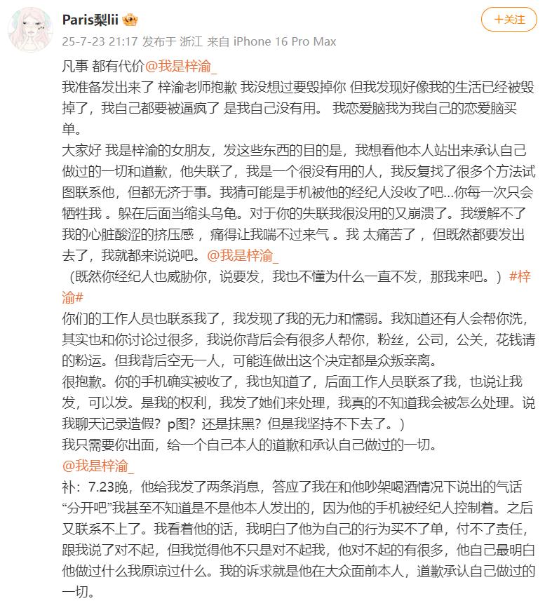 女子控诉男星梓渝隐瞒恋爱、冷暴力……刚刚,梓渝发文道歉:会暂停一段时间的公开工作
