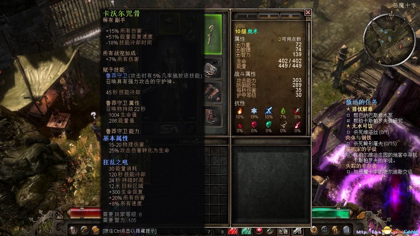 各位,不知有人发现过没有,在游戏的早期就能使用的一个极品装备(如图),关键是加了50%的能量回复速度,这对走奥术路线的朋友是极好用的。具体地点在尸妖泥传送门往前过河,找到河对岸一个房子前面,在这个房子门前一个毫不起眼的骸骨里。(已经知道的朋友跳过)