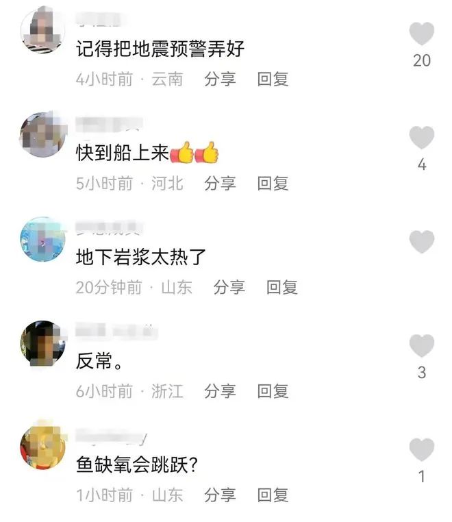 有人猜测,这会不会是地震或者地质灾害的前兆;也有人认为,可能是天气闷热水中缺氧造成的;还有人怀疑是否是水受到了污染。