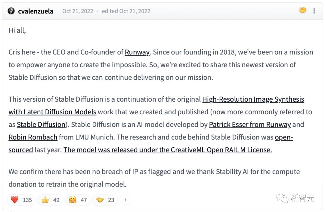 而Stability的发言人Bishara则表示,公司在官网和Stable Diffusion的GitHub页面上都曾多次公开提到了LMU和Runway的贡献。
