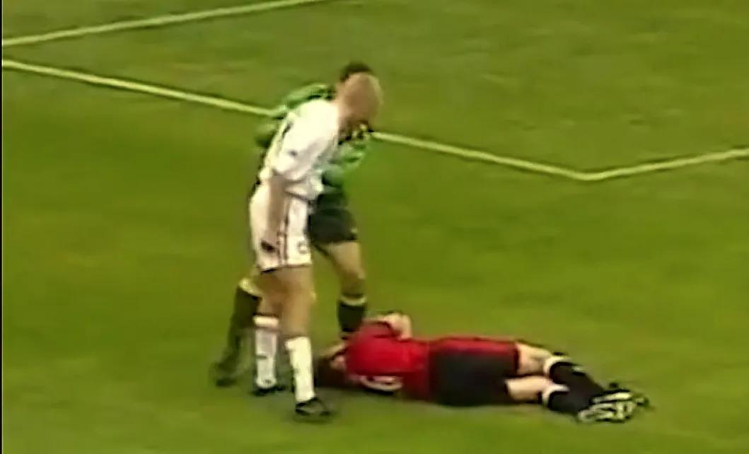 1997 年的一场曼联对阵利兹联的英超比赛中,罗伊·基恩在与老哈兰德的拼抢中十字韧带损伤。不知情的老哈兰德跑来嘲讽基恩“快起来,你在演戏!”