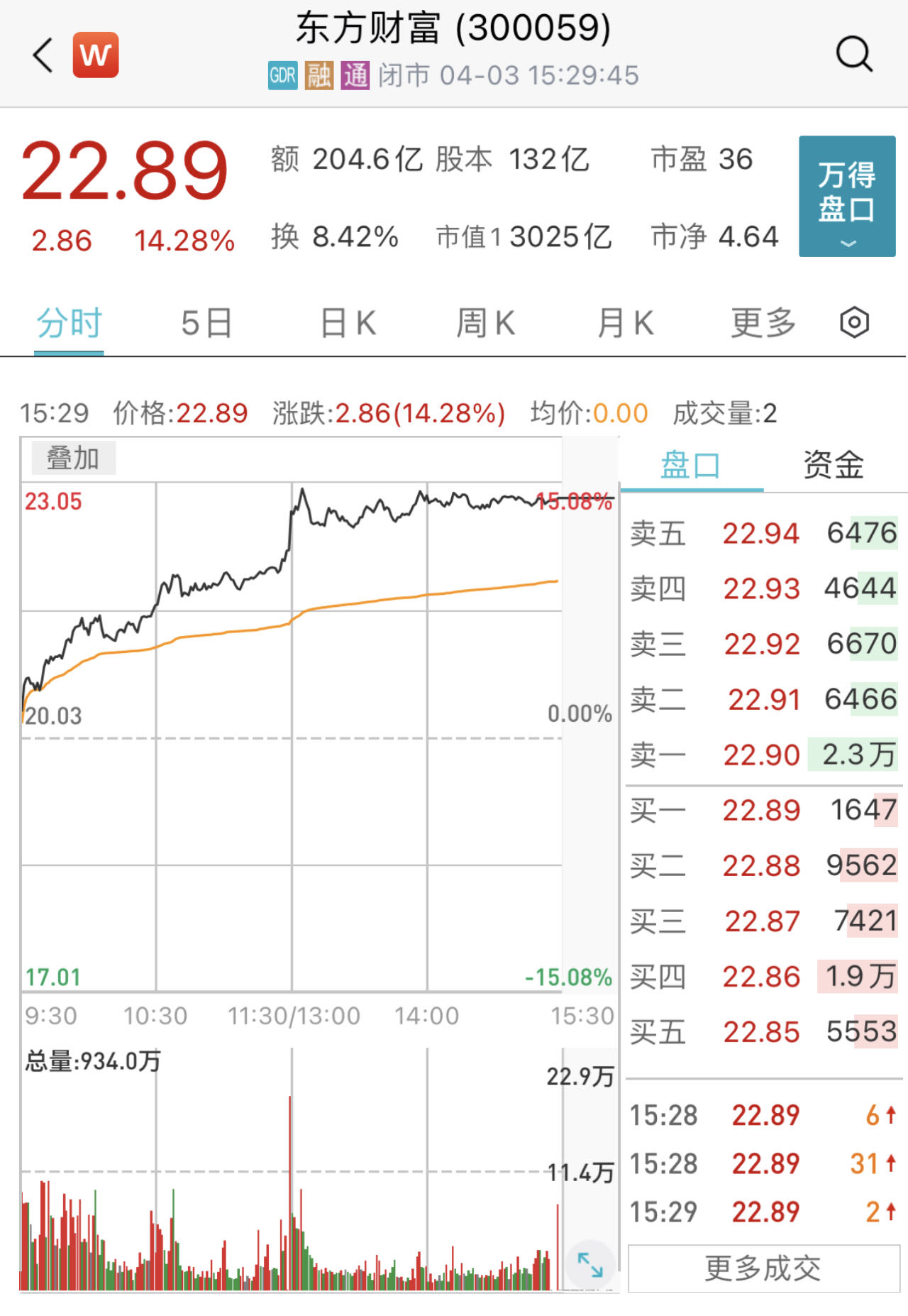 东方财富股价4月3日出现“狂飙”,大涨14.28%,收报22.89元/股。同时,成交额突破200亿元,达到204.58亿元,为该股2010年3月19日上市以来最高单日成交金额。截至收盘市值超过3000亿元,达3025亿元。