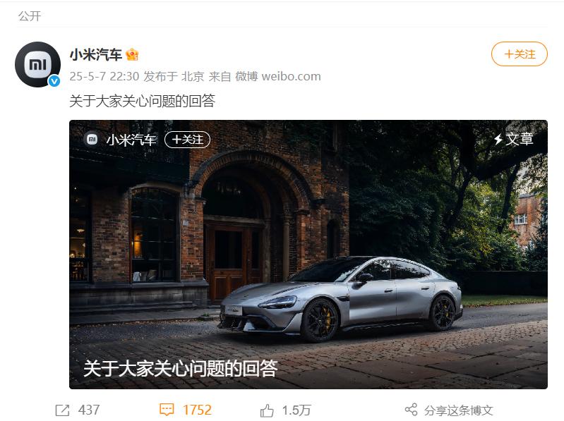 5月7日深夜,小米汽车就此问题在《关于大家关心问题的回答》中发文回应:确实存在不妥,已暂停了这次推送,我们深表歉意。#小米汽车#相关话题冲上热搜第一。