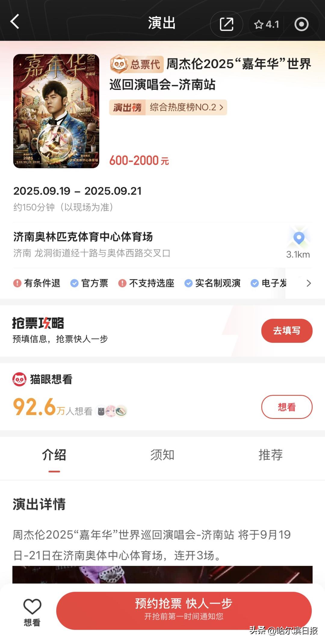 周杰伦演唱会济南站官宣!连唱3天,日期、7档票价出炉!已超92万人想看,或为北方唯一举办地