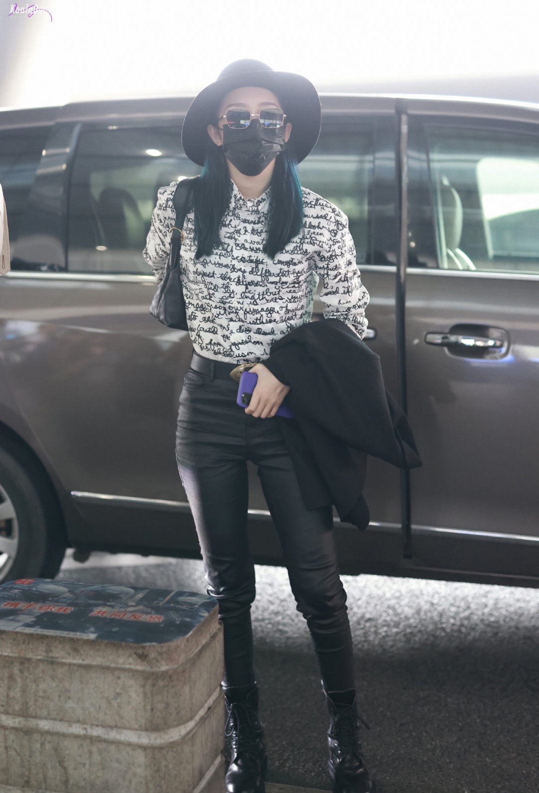 这一次的机场穿搭我们可以看到孟美岐选择的是非常酷的造型,首先上衣部分她搭配的是一件设计感十足的衬衫,衬衫采用的是个性印花装饰,给整个穿搭注入了灵魂,外面她搭配了是经典的黑色西装,下装孟美岐选择的是一条紧身皮裤以及马丁靴,将她的一双美腿凸显出来,这一天她利落的短发,再配上个性的礼帽装饰,女明星范儿十足。