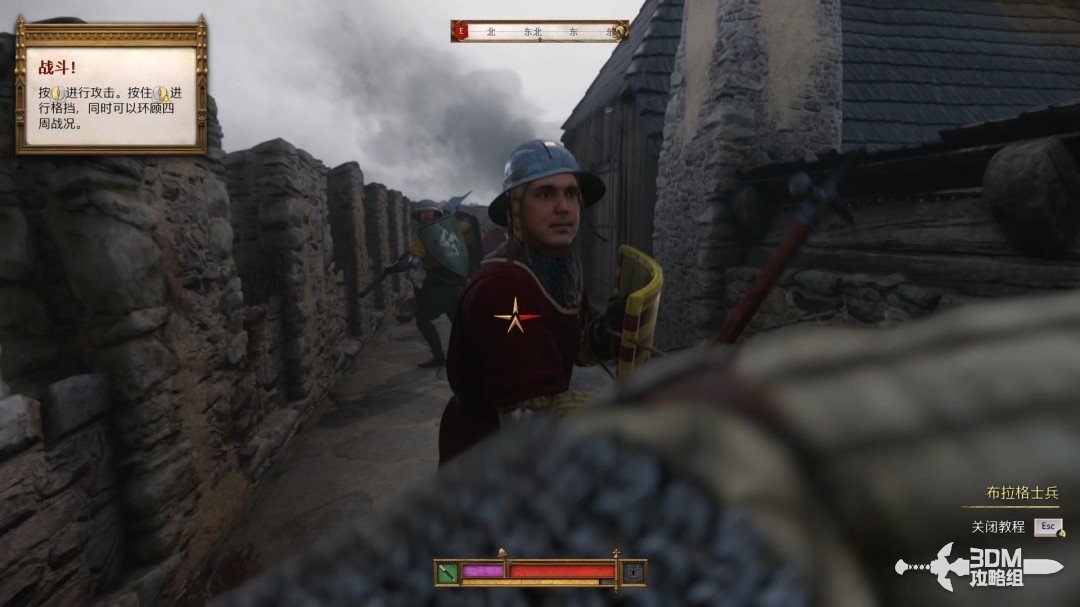 此时也会教我们怎么使用武器战斗,鼠标左键是进攻,右键是格挡,被击败的敌人可以按E键搜索他们的尸体。