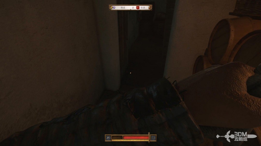 按E拿上面粉,进入酒店,这个酒桶的后边有个门,门里面就是我们要去的储藏室。
