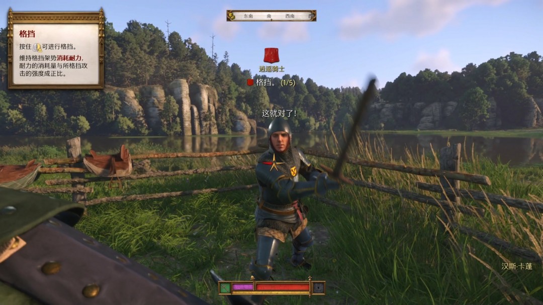接下来是格挡,我们只要一直按住鼠标右键就可以格挡住敌人的攻击,格挡也会消耗耐力。