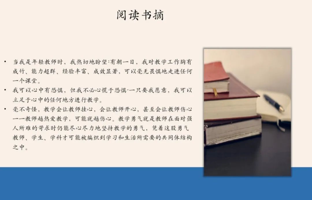 此外,书中关于“恐惧”的探讨也给了我很大的启示。帕尔默认为,恐惧是教师成长过程中的一部分,但我们不能被恐惧所束缚,而要以勇气面对它。在班级管理和教学中,我也曾面临各种挑战和困难,而恐惧往往会让我犹豫不决。然而,通过阅读《教学勇气》, 我明白了要敢于面对自己的恐惧,将其转化为积极的动力,不断挑战自己,提升自己的教学能力。