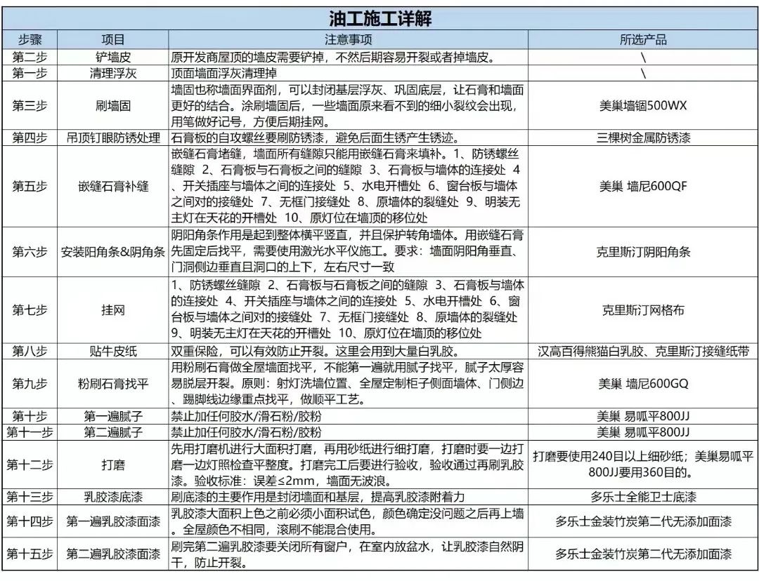 最后附上万能的油工施工详解表格,希望大家可以油工施工不翻车~