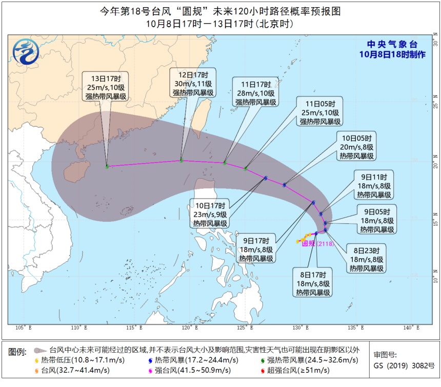 新海南客户端、南海网、南国都市报10月8日消息(记者 姚皓)据中央气象台播报,今年第18号台风“圆规”于10月8日下午生成。当日17时,“圆规”的中心距离菲律宾马尼拉偏东方向约1130公里,中心附近最大风力8级(18米/秒)。预计,“圆规”将以每小时12公里左右的速度向东北方向移动,强度变化不大。并根据中央气象台未来120小时路径概率预报图显示,台风“圆规”或将于10月11日至12日前后进入南海海域,并于13日前后趋向海南岛。