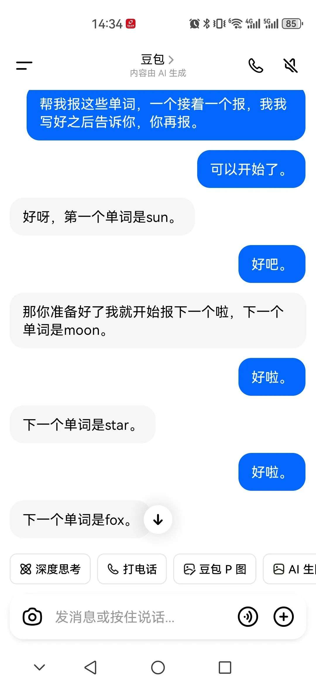 - 和豆包进行对话: 帮我报这些单词,一个接着一个报,我写好之后告诉你,你再报