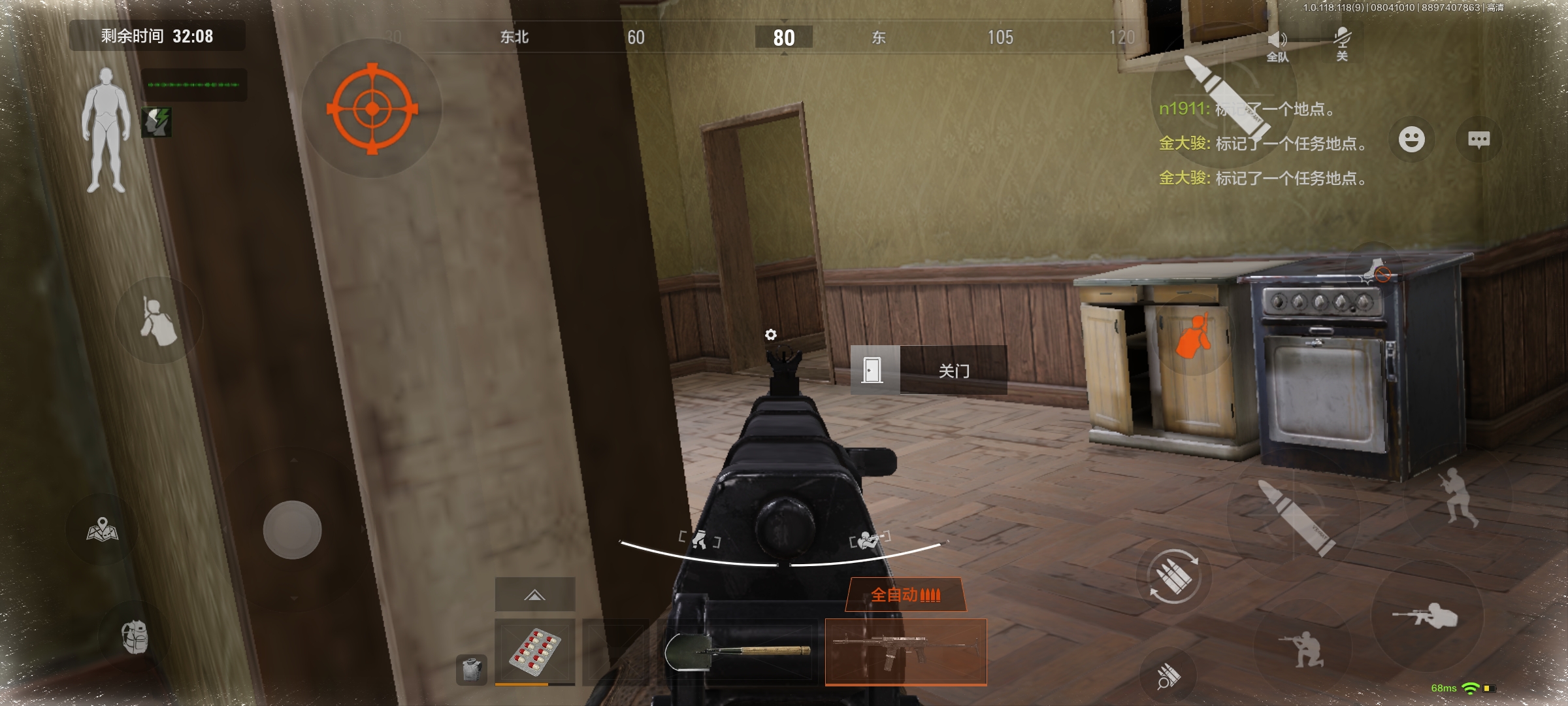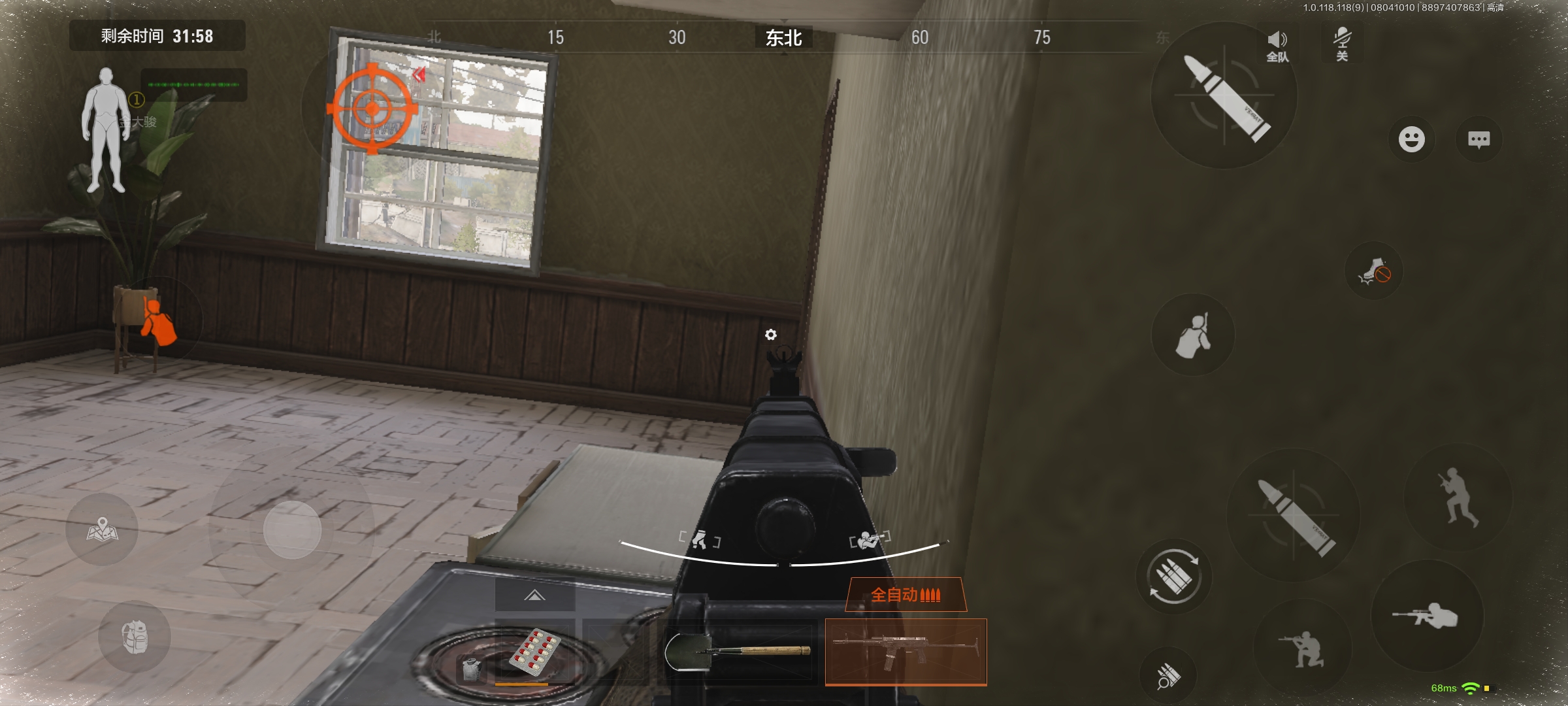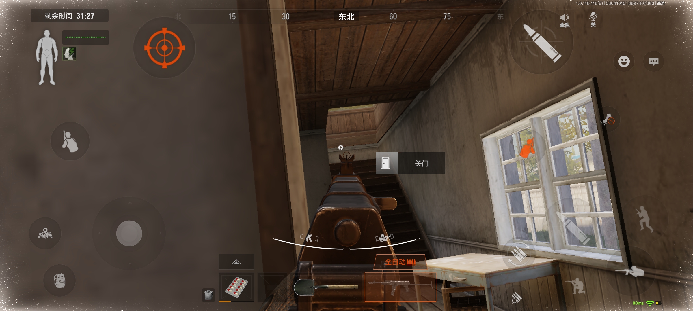 然后在房间对着楼梯口架枪,看见敌人扔雷的话我们可以立马回房间躲起来,在房间里也可以靠着墙角架枪。如果我们在架枪的时候听到敌人捏雷的声音,可以直接冲过去打。一般敌人很难反应过来。