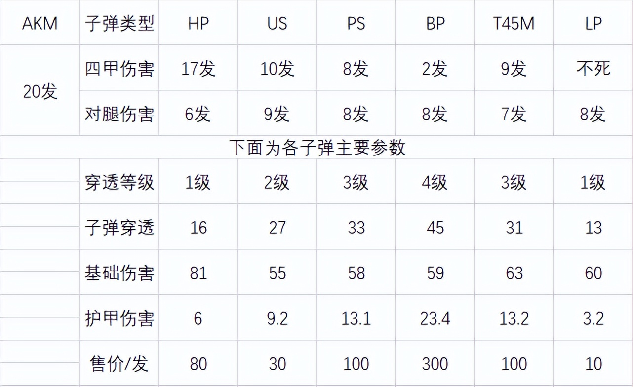 和G18C测试方法一样,用20发子弹测试对腿部和对4甲伤害。可以看见这里面HP子弹肉伤最痛,只要6发就可以打死敌人。BP弹对甲伤害最高,但也最贵。除去HP子弹,其他子弹对腿伤害基本上差不多所以如果是用AKM蹲人打脚或者腿,就用HP即可。