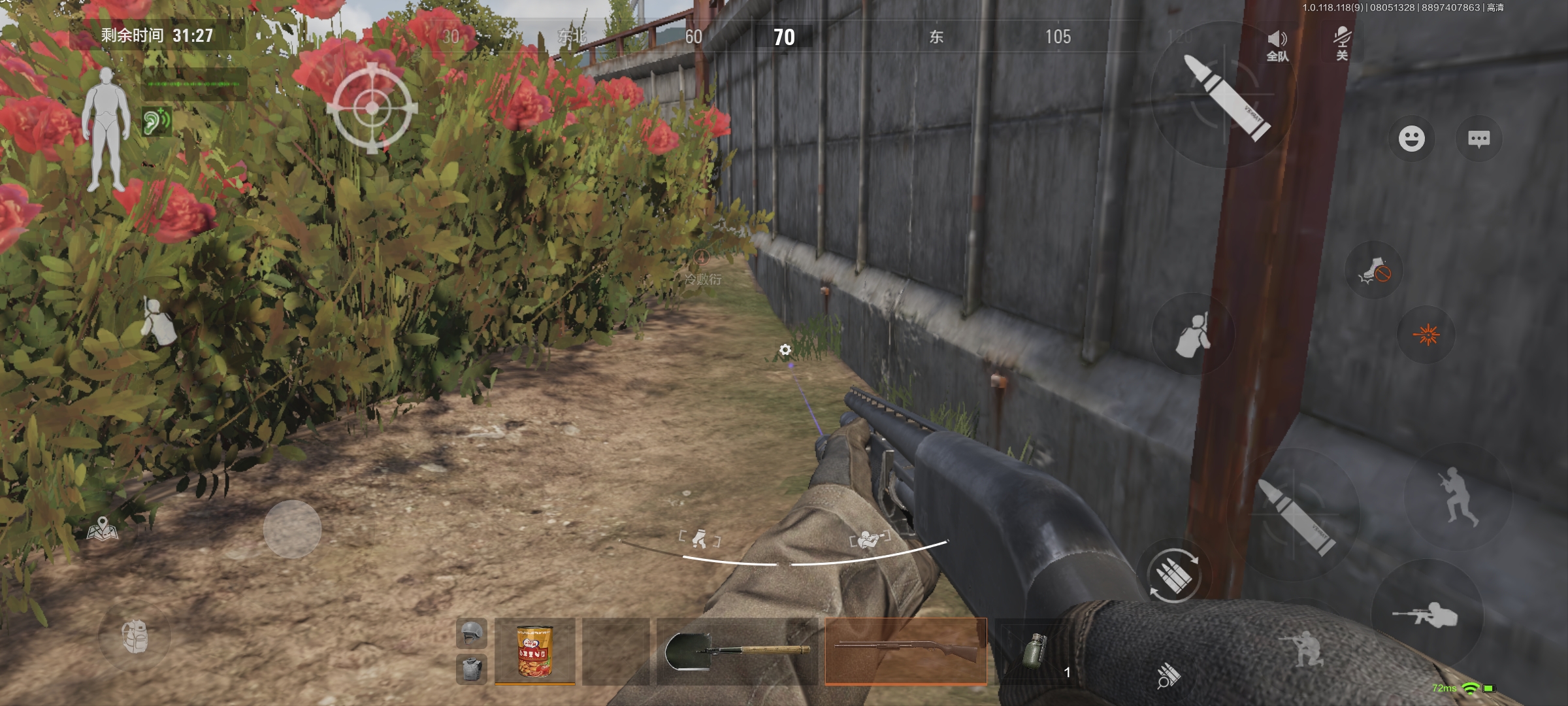 其次,当我们走到麦田尽头的时候(上图),建议在墙和花之间的空隙蹲着等体力恢复,还能听一下别墅附近有没有人。等体力回满再一次性冲到别墅里面。