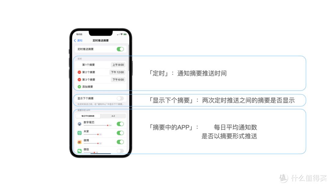 3 「摘要中的APP」:可以查看单个APP通知次数,也可以直接选择是否将APP通知以摘要的形式推送。