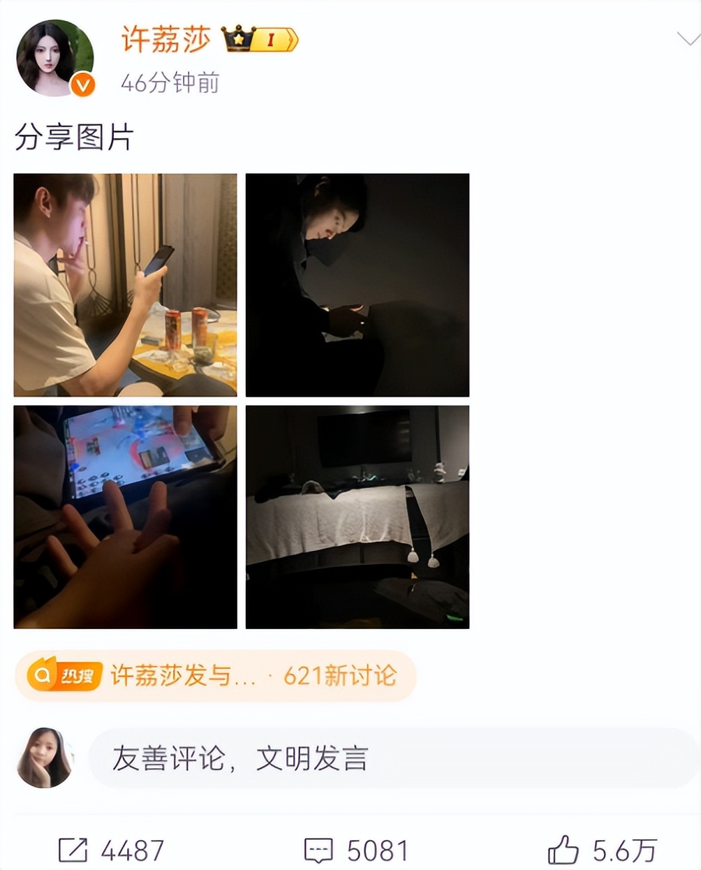 可许荔莎不服硬刚,不仅发出和徐凯孤男寡女共处一室的照片,还有一起在床上玩手游的亲密照。
