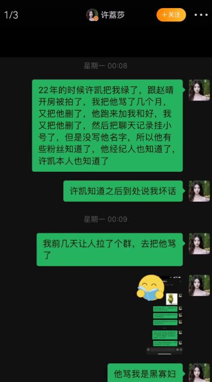 她把自己置于受害者角度,控诉许凯出轨后两人曾短暂复合,但没想到,许凯背地里会当着朋友的面骂许荔莎。