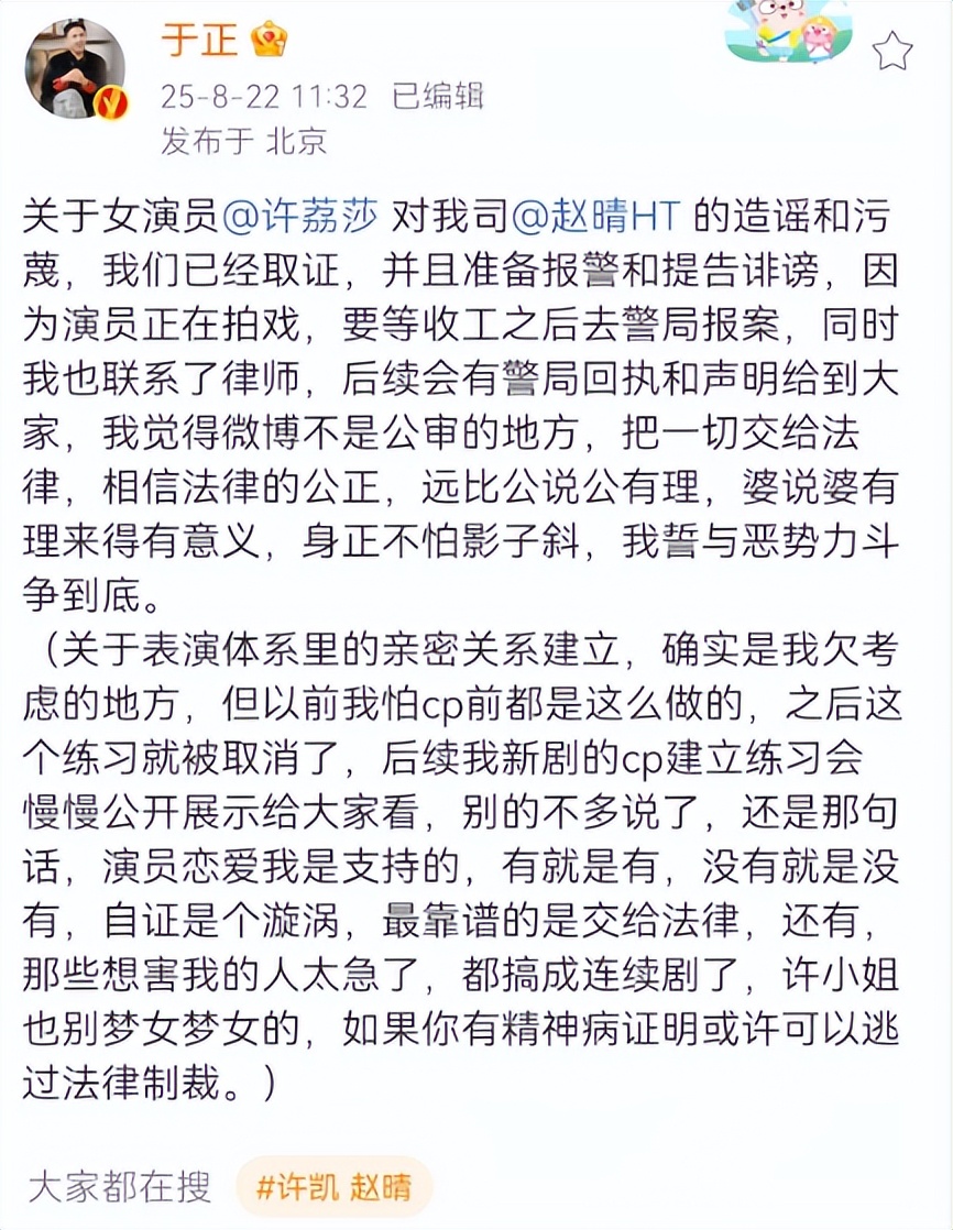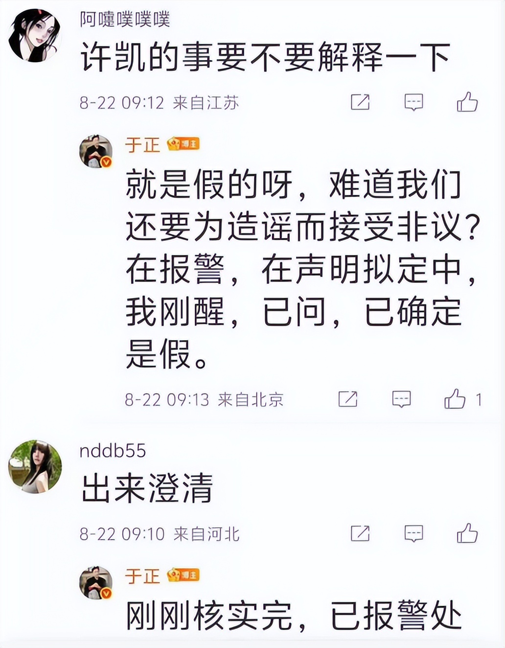 不管是徐凯还是赵晴,都是于正眼下正要热捧的人,于正也在第一时间回复,假的,已报警。