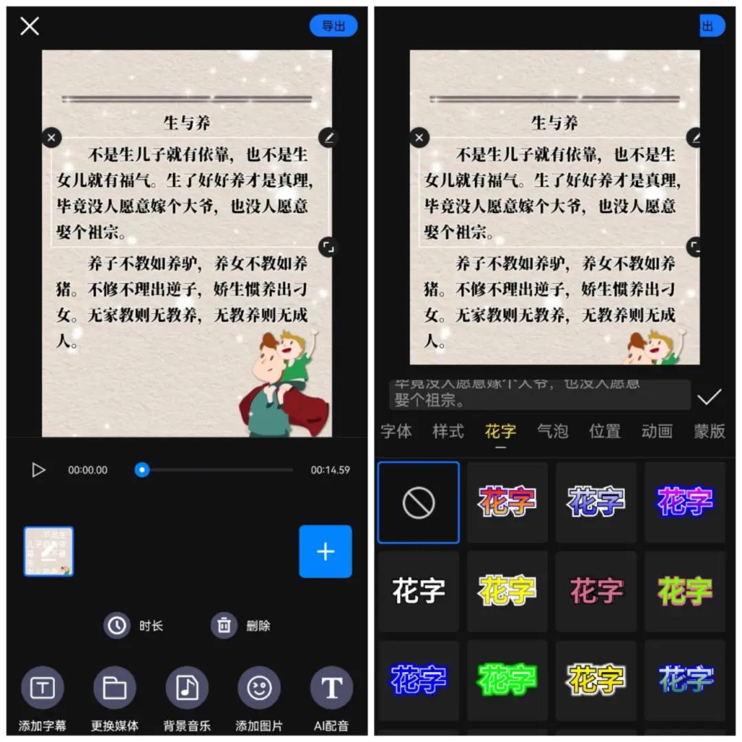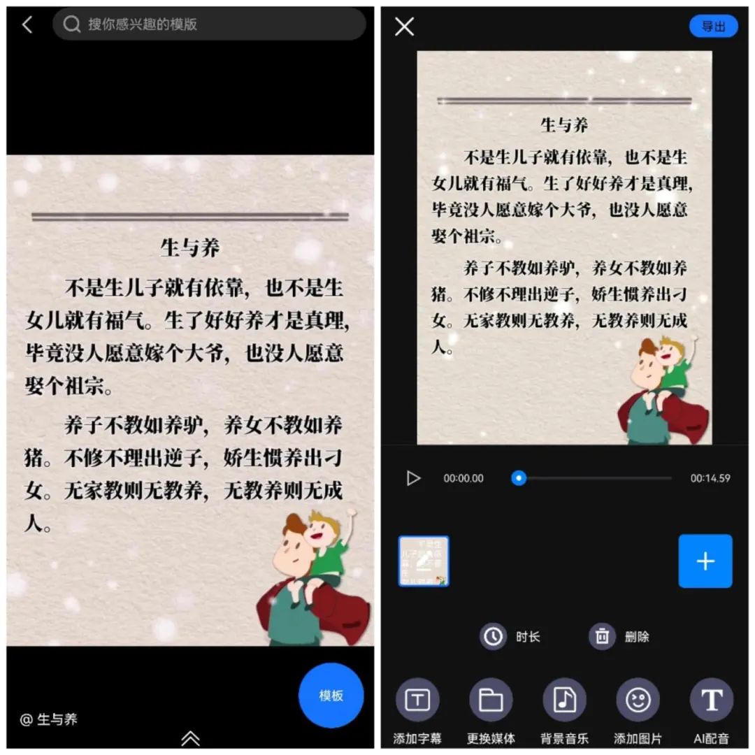 点击选择自己喜欢的模板进行制作,支持添加字幕、背景音乐、图片、AI配音等。