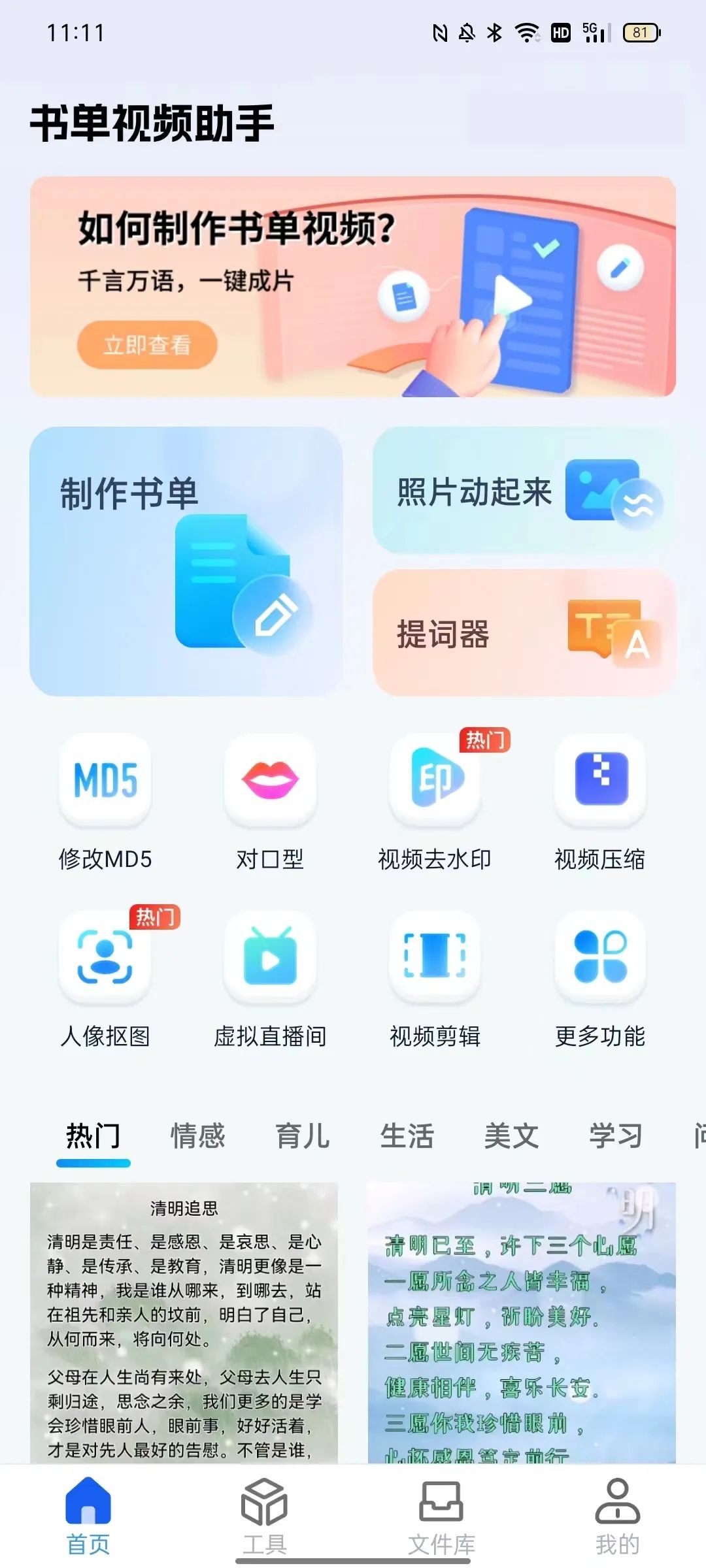 这是一款专业的书单视频制作软件,功能丰富,除主功能制作书单以外,还可以用于视频剪辑、压缩、修改MD5值、视频抠像等多个功能。