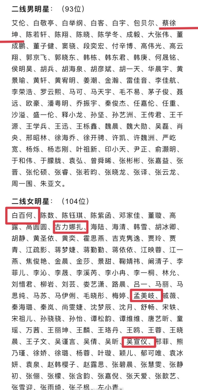 还有肖战、王一博可以凭借超高的人气评为一线明星,那为什么蔡徐坤、华晨宇2位同样具备这些条件,却只能屈居二线男星战队?这个评审标准是按流量、上热搜次数来评选?还是按艺人的演戏数量来衡量?