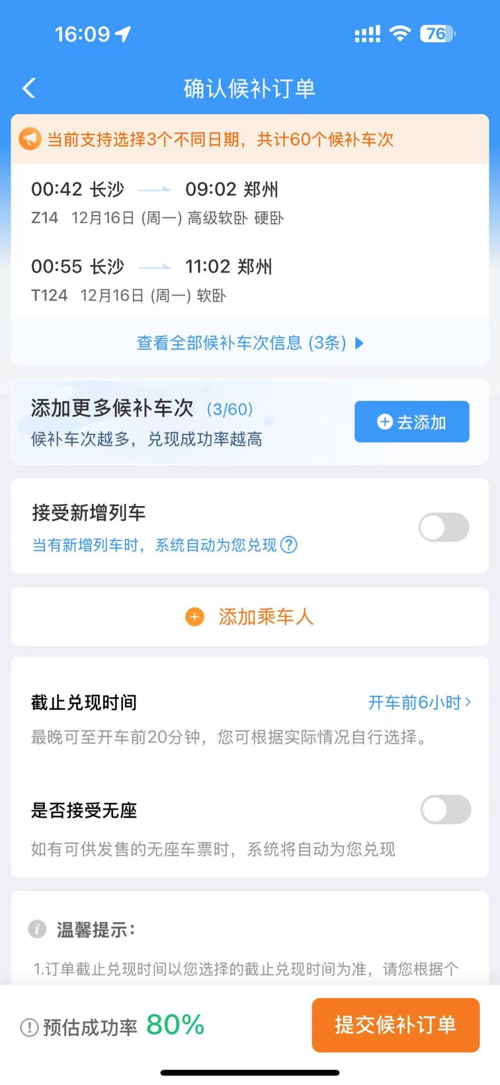 ▌建议多提交几个“时间+车次+席别”的组合,每个用户可有6个待兑现候补订单,每个订单可选择3个日期、60个车次,最多可添加9名乘车人。