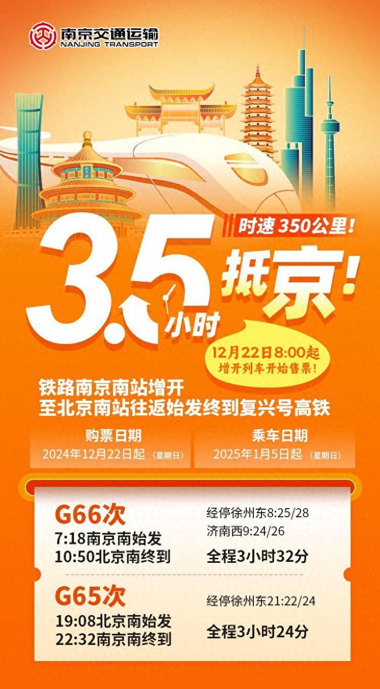 G66次列车将于2025年1月5日上午7:18从南京南站始发,途经徐州东站、济南西站,于当日10:50终到北京南站,全程3小时32分。