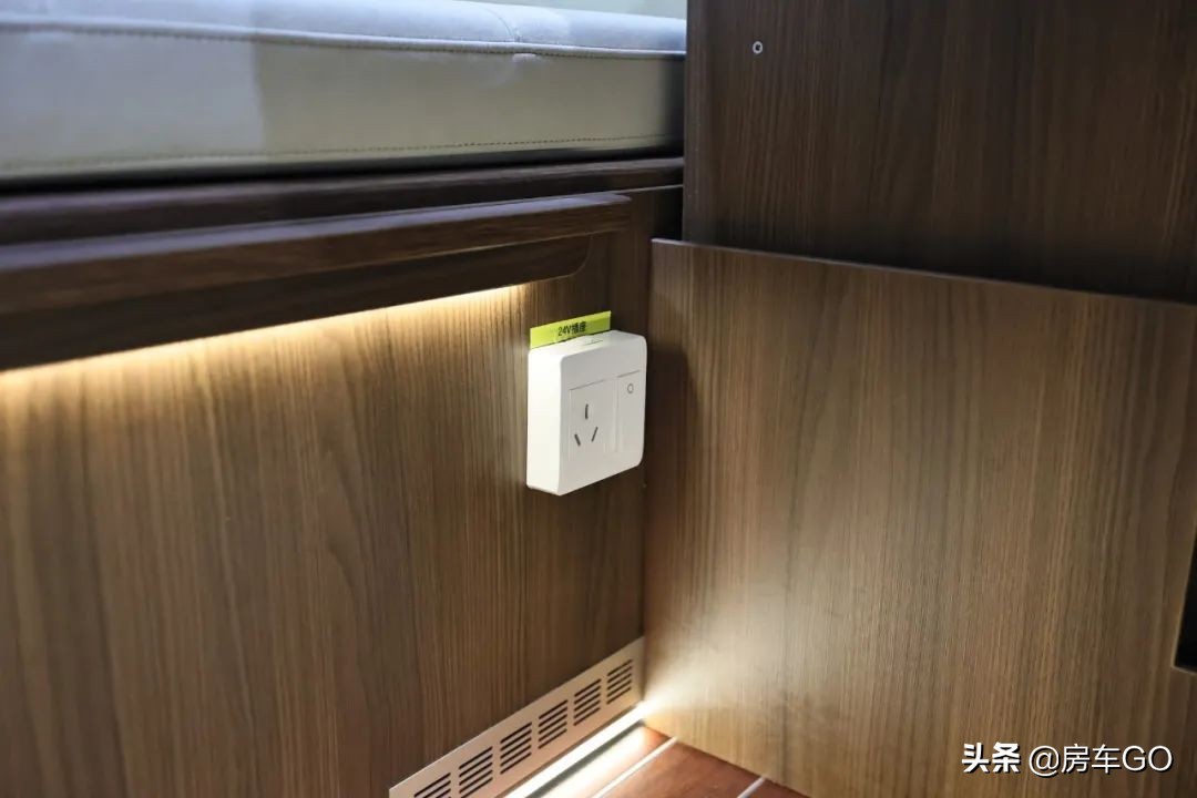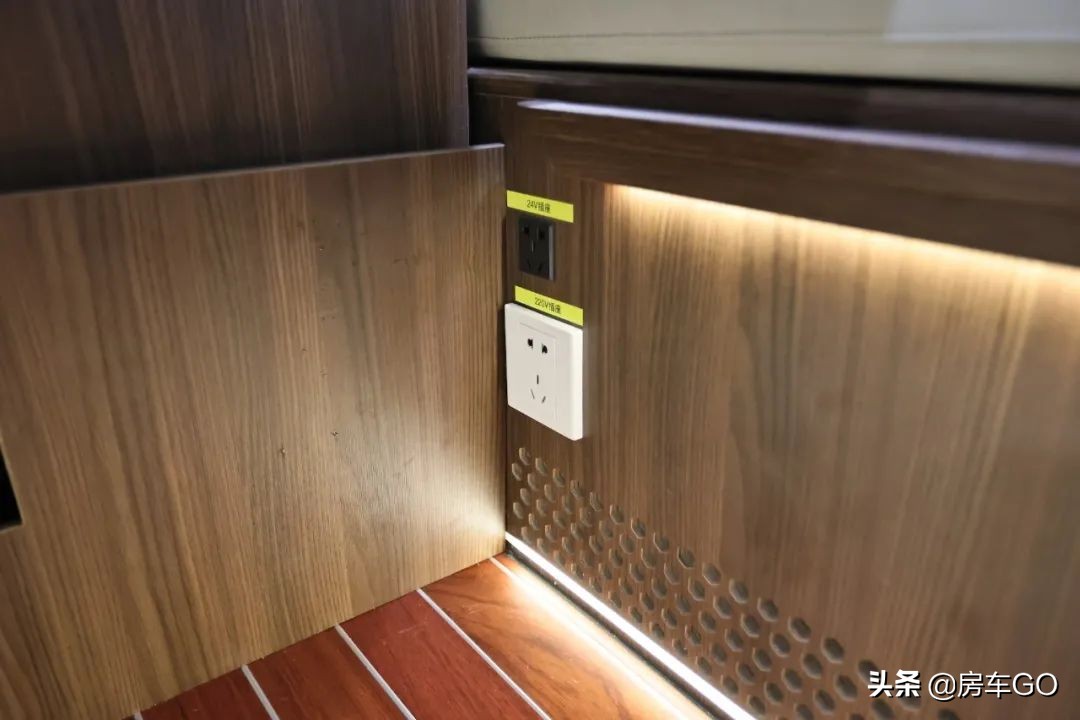 全车控制面板位于空调一侧,下方为升降顶控制机构,电路系统搭载24V 240AH锂电池组(约6度电);行车充电为双12V发电机,最大充电功率可达1000W/h。水路搭载68-100升净水箱以及36升灰水箱。