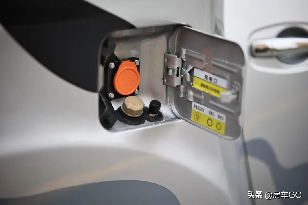 下面来说说车外的配置,车身的右侧是车辆的220V充电口、注水口以及国六柴油的尿素加注口。