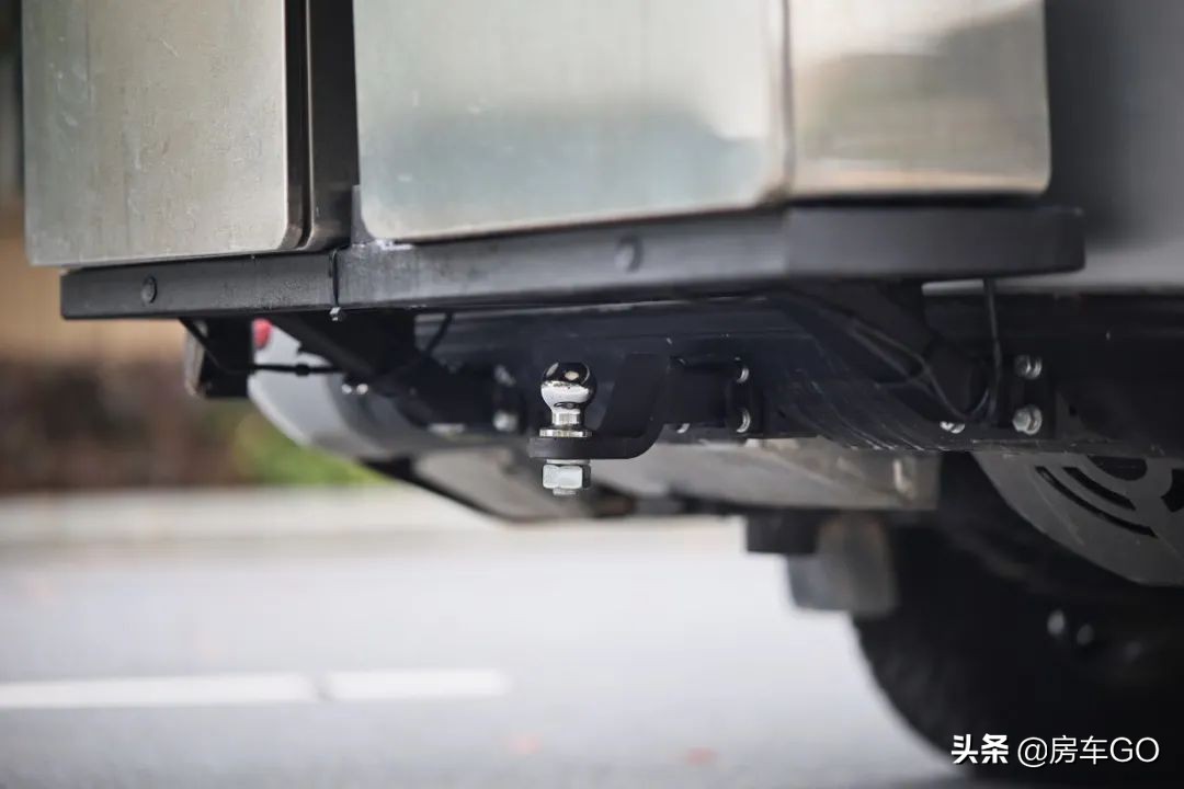 车尾配置丰富,从上到下为倒车摄像头、备胎、兵工铲、脱困板、全不锈钢储物空间以及拖车钩,让这台房车在穿越的路上变得更加从容。