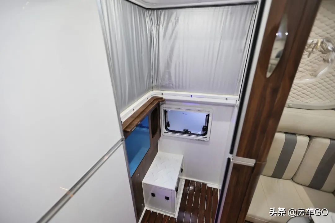 卫生间部分也是霞客乐SUC的一大亮点,采用了专利设计的折叠式结构,保证在适应升降顶结构的同时,拥有一个独立卫生间。