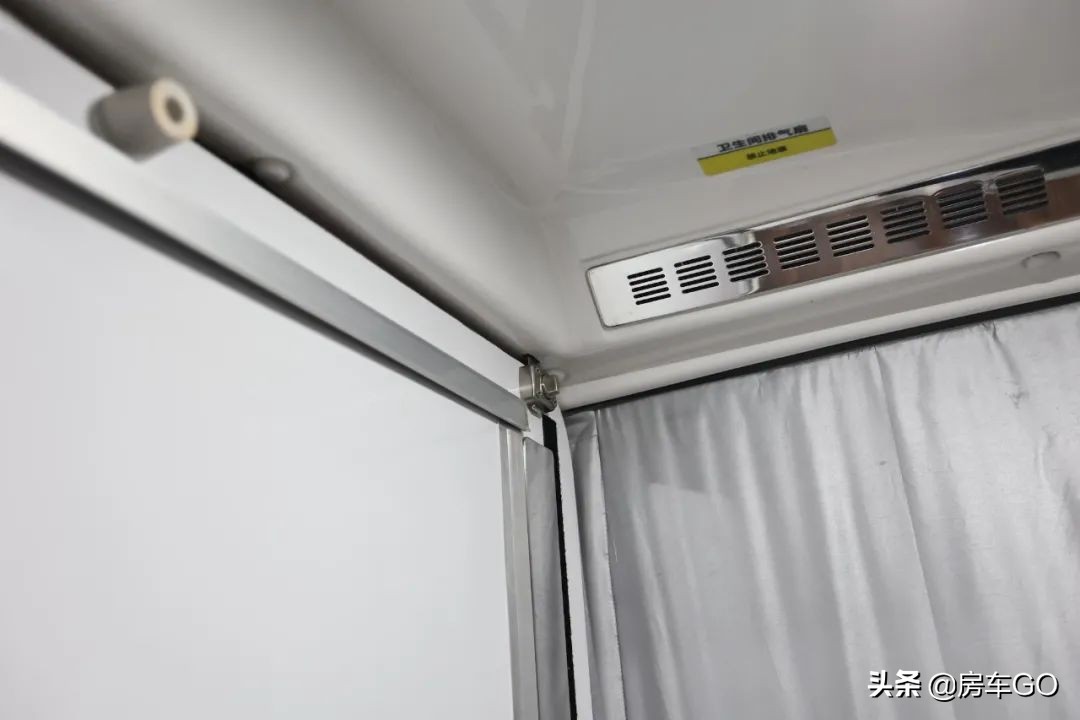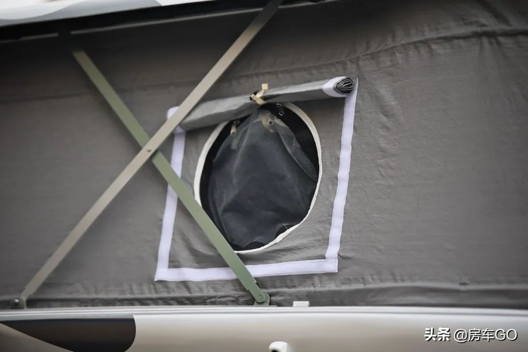 篷布采用了A3级别的防刀割布料,中间为隔音隔热隔热层,内部为防污保温层。透气窗带有纱布来透气,据厂家人员介绍,开窗面积做得比较小巧,是为了防止房车在野外被野生动物袭击,通过透气窗户钻进车内。