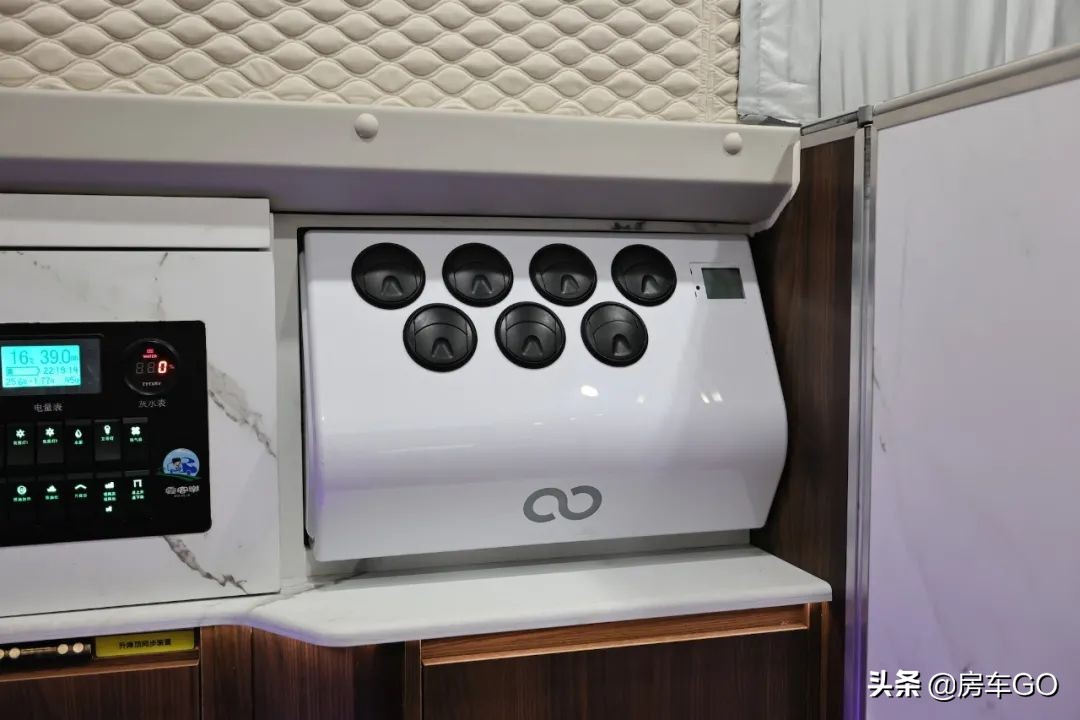 车尾搭载的一台24V驻车制冷空调,下方是储物空间以及多媒体控制旋钮。