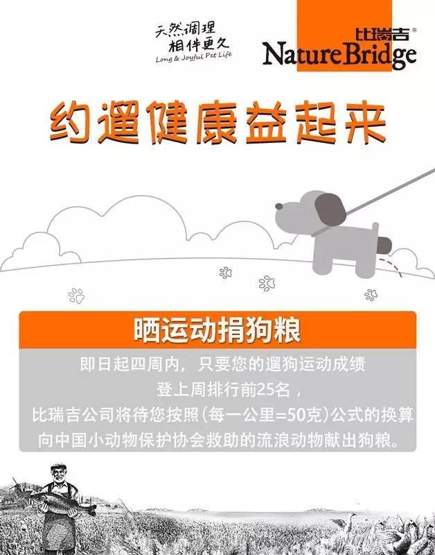 5月2日起四周 ,遛狗时在狗狗去哪儿APP中点击【约遛】,只要您的遛狗成绩登上周排行的前25名,比瑞吉公司将待您按照(每一公里=50克)公式换算,向中国小动物保护协会救助的流浪动物献出狗粮。
