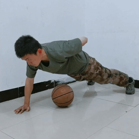 摆出标准俯卧撑最高点时的姿势,将篮球放在髋部下方。将一只手撑在胸部下方的地面上,手臂伸直,另一只手背在身后,此时双腿张开,目的是使腰部不下榻。接着弯曲肘部,直到髋部轻触篮球。这是该动作的最低点。暂停一下,然后将自己推回到起始姿势。如果做不了单臂半俯卧撑,战友们可以把篮球放在膝下,做四分之一单臂俯卧撑。练习一段时间之后,就一点点向前移动篮球,加大动作幅度。