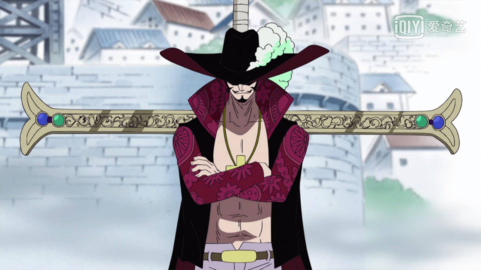 德古拉是Dracula,有三个音节Dra cu la,Dracul只有两个音节dra和cul,而朱拉可尔dracule按照英语发音规则最后一个e不发音(日式英语大概会吧),也是两个音节Dra和Cul,从发音上来看朱拉可尔dracule和龙公dracul是一样的。不过弗拉德二世这人不如他儿子有名,一来是因为他不像他儿子一样有刺穿癖(啊?),二来是没人以他为原型写小说,那么他的生平事迹里有什么元素能和鹰眼搭上边呢?答:龙骑士团。因为是基督教组织,所以和鹰眼身上的十字架元素互相呼应。说到十字架就不得不提海贼世界里的“浪花十字”。这种十字架在现实中叫莫林十字(moline cross),没有什么特别的宗教含义,主要是好看,用来当徽章(?)。在海贼世界里这个纹样屡次出现,有大佬分析过这个标志的含义,认为和D之一族/古代王国/空白一百年有关,我在此不赘述了。如果认同浪花十字/莫林十字有特殊含义的假设,那么黑刀夜的剑格加上剑柄剑身也形成了这个形状,是不是表示鹰眼的身世和这种十字架代表的东西有关呢?或者从另一个角度看,十字架代表的是一种宗教信仰,而对于鹰眼来说能成为他信仰的唯有剑道。十字架本是罗马人的刑具,是耶稣和其他圣徒被钉死在十字架上之后让其拥有了宗教含义和“死亡””殉道”的象征。不过古罗马的十字之刑并不是直接钉死,而是要先让受刑者背着十字架走上很长一段路游街,而鹰眼背着剑的剪影就很像一个背着十字架的人,既是处刑者,也是受难者。一种解读可以是他游荡在伟大航路前半段就像死神一样收割弱小的海贼团队,而另一种可以说他是行走在自己剑道上的殉道者,因为他所追求的剑道尽头终究有一场和索隆的对决并且(读者知道)他会被打败。