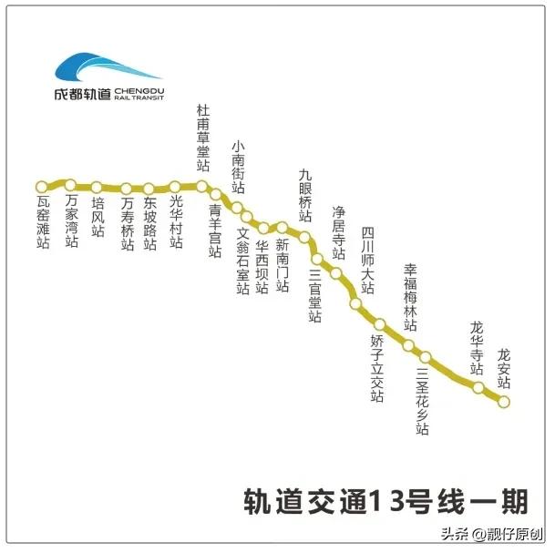 13号地铁一期线路,从青羊区瓦窑滩站到龙泉驿区龙安站,全路段共有21个站点,全长有29.07公里,沿途经过四大区域,青羊、武侯、锦江和龙泉驿区,其中光华村、杜甫草堂、人民公园、华西坝、九眼桥、川师大、三圣乡都是成都市非常有名的地方,也是贯穿几大区域的重要交通线路。