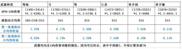 曾经一度,均伤成了DH各BD的最佳选择,但实际上,根据BD和打法的不同,并不一定均伤就是最佳。而且,第二条均伤的递减也是需要考虑的。下表中包含了DH能用到的各武器BD中,第一个戒指用均伤,和两个戒指都用均伤的收益。