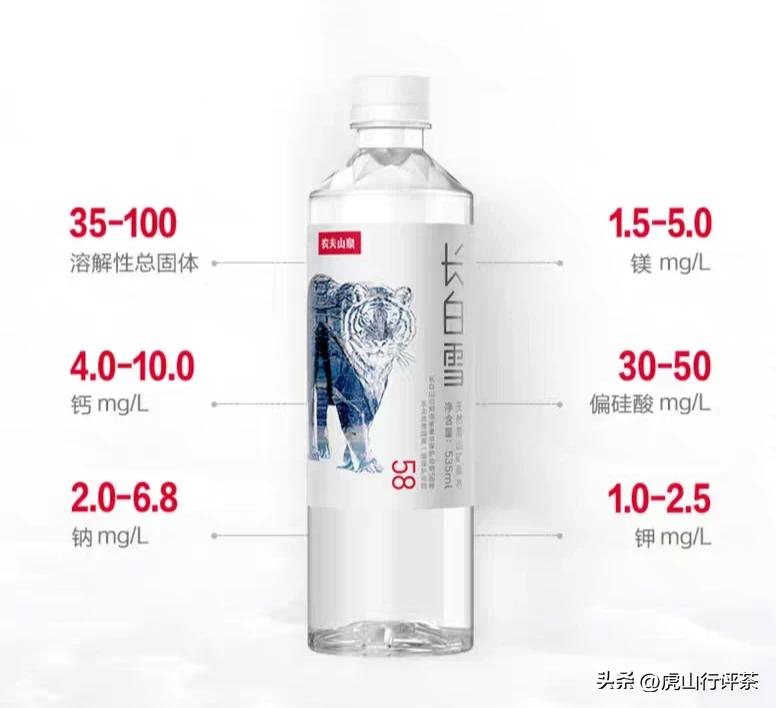 农夫山泉长白雪矿泉水中,溶解性总固体含量为35-100,含有镁1.5-5.0mg/L,钙4.0-10.0mg/L,钠2.0-6.8mg/L,钾1.0-2.5mg/L,偏硅酸30-50mg/L。