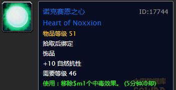 说实话我是不想把他列入进来的,最初感觉占格子,因为有很多饰品可以选择,但是有一天我在野外连续经历了多次战斗之后,其他饰品均已CD,唯独它没有使用,我就换上了,刚走两步碰到了一个盗贼偷袭我,结果解毒起到了关键性作用(可以移动读条使用),盗贼被我拉开距离风筝而死。级别高了之后入手相对简单,它的产地就是猎人挖掘第一桶金的地方玛拉顿boss诺克赛恩。